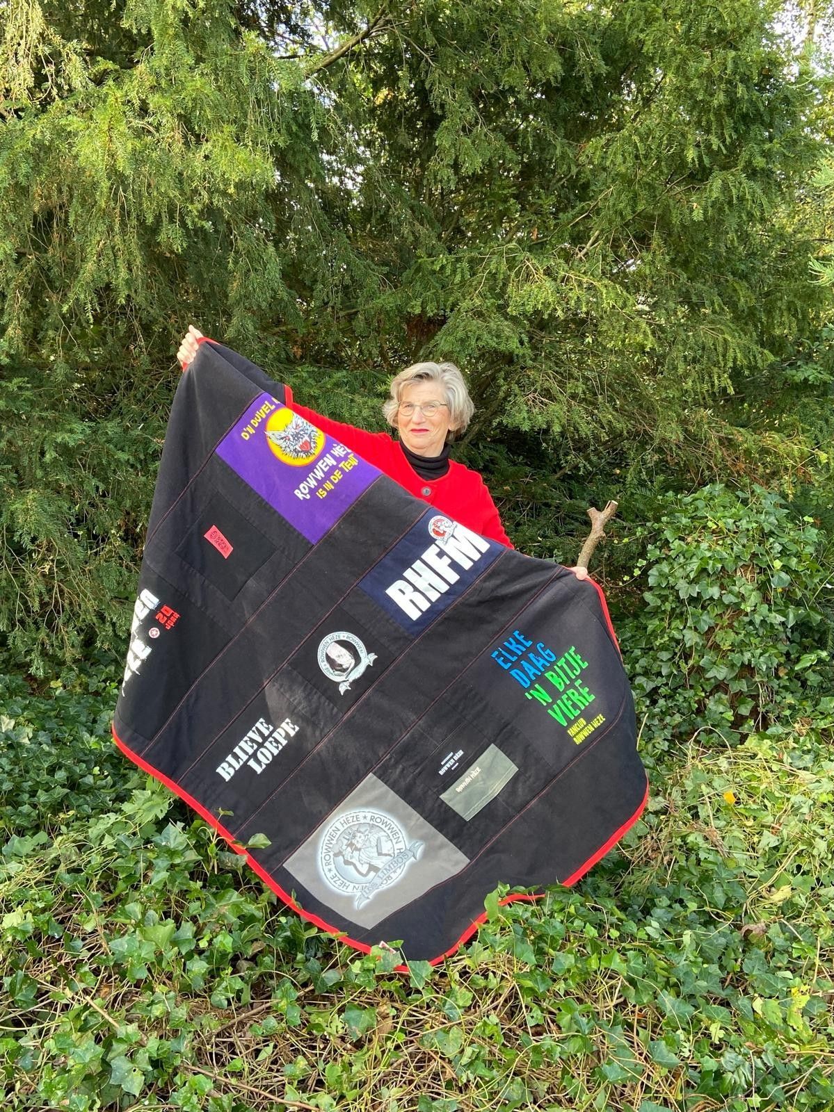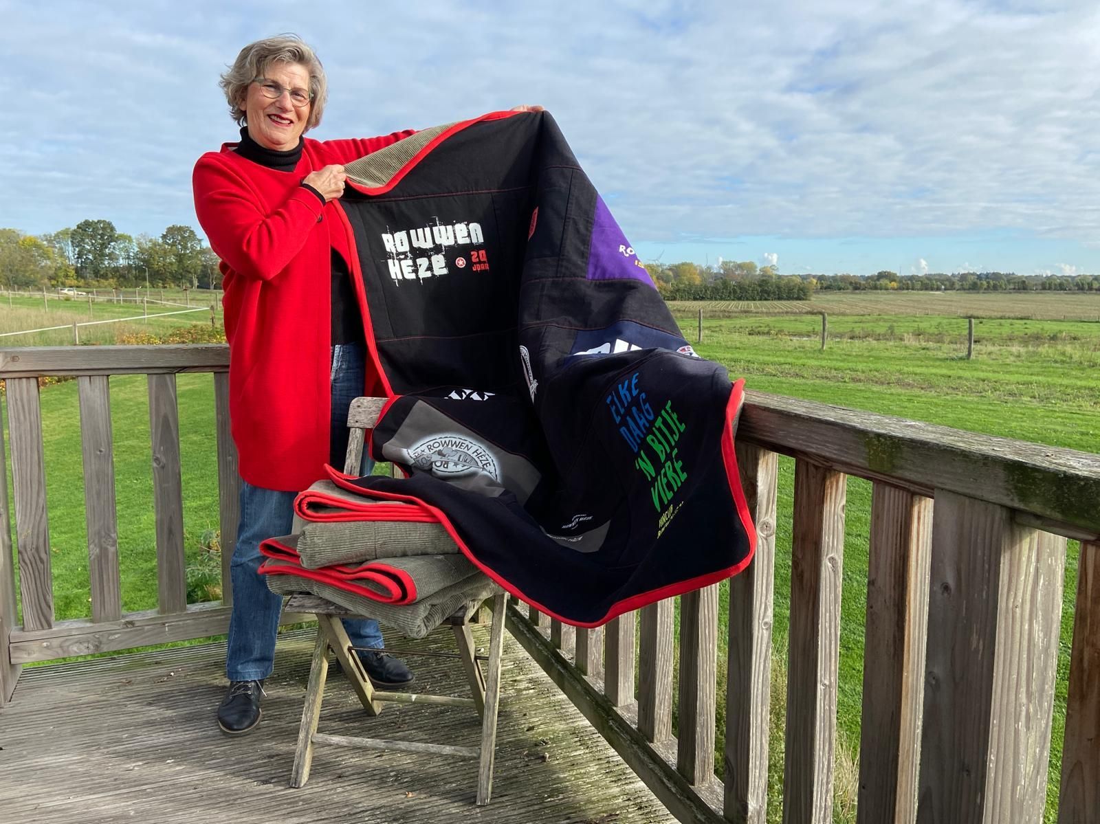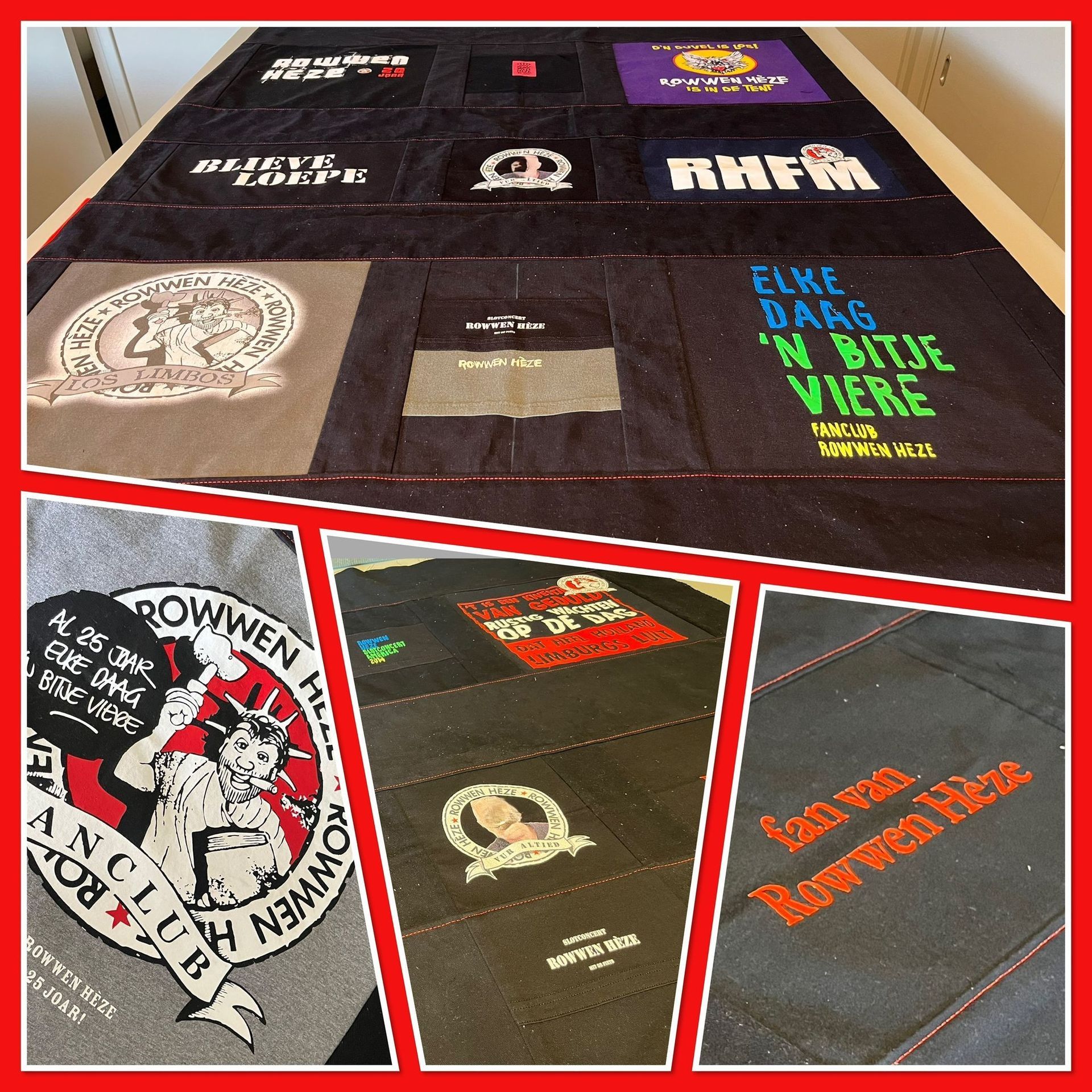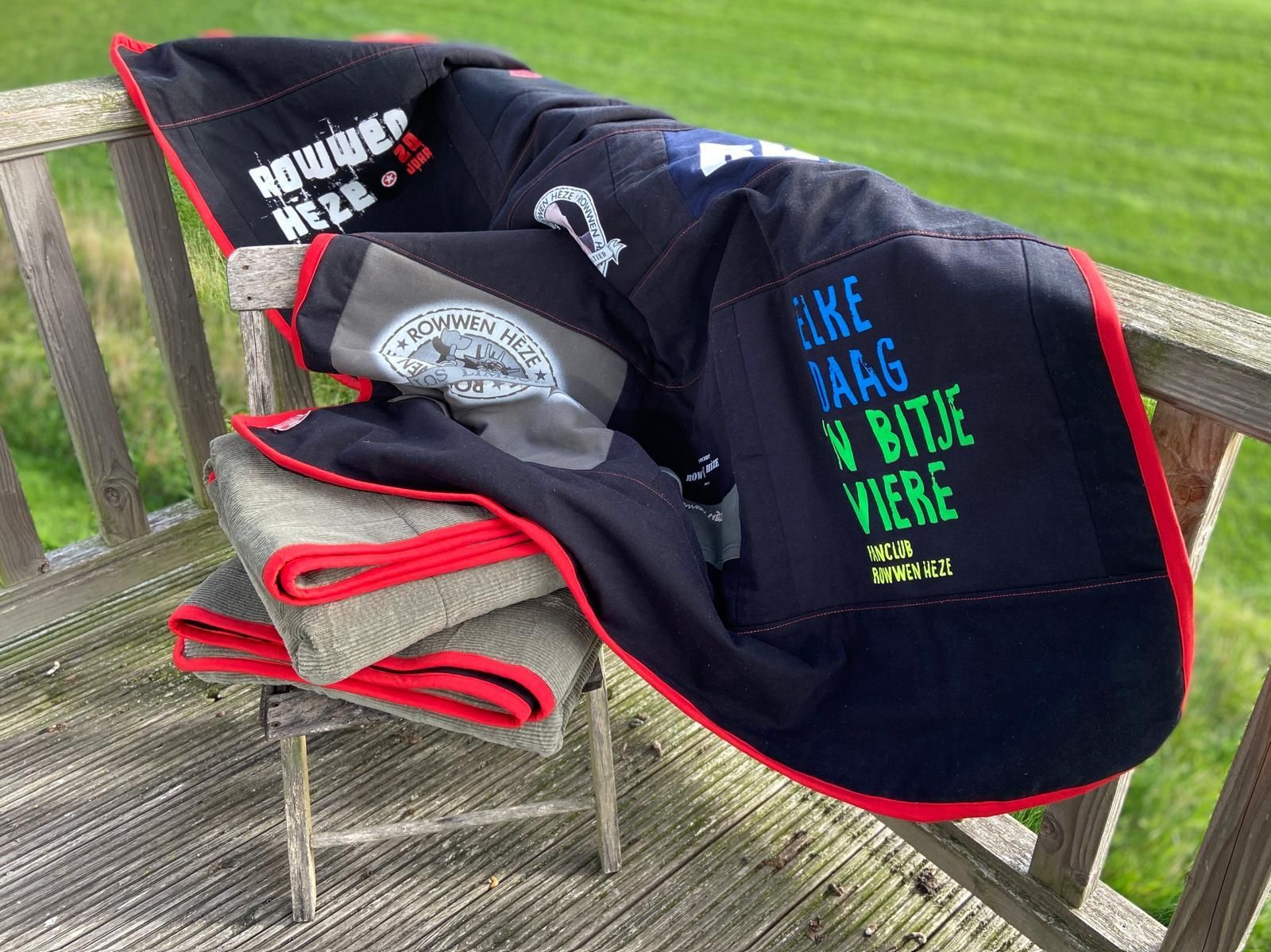 Zijn vrouw wilde als verrassing voor hun drie zonen stoere dekens van al zijn Rowwen Hèze-shirts laten maken. Voor zichzelf koos ze een kussen van zijn rood-zwart geruite werkhemd. Het binnenkussen maakte ik van zijn Rowwen Hèze-shirt, met daarin verwerkt de tekst ‘Blieve loepe’.