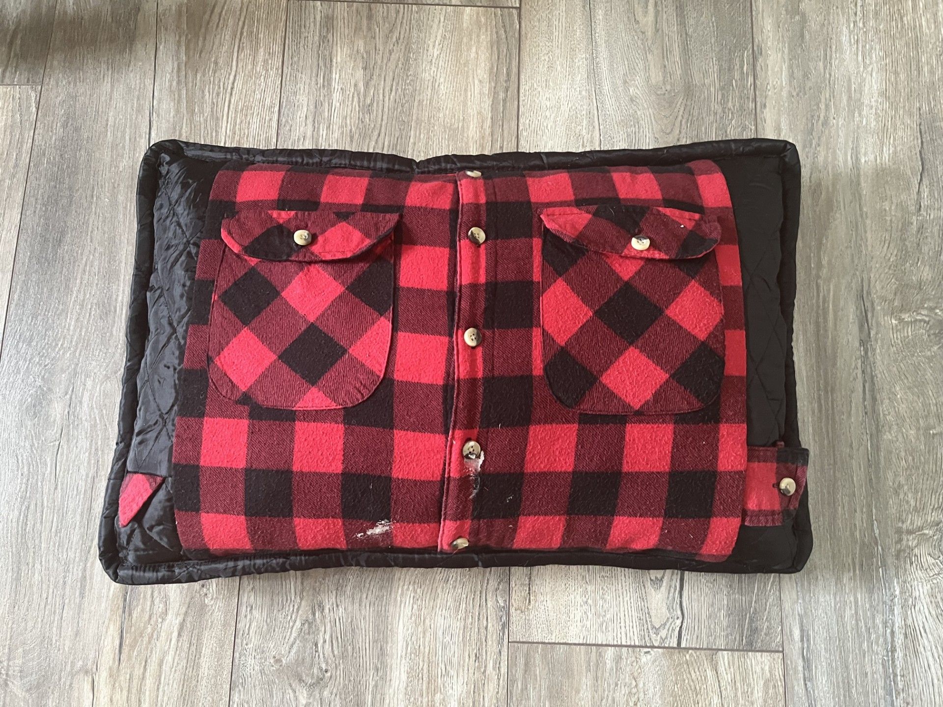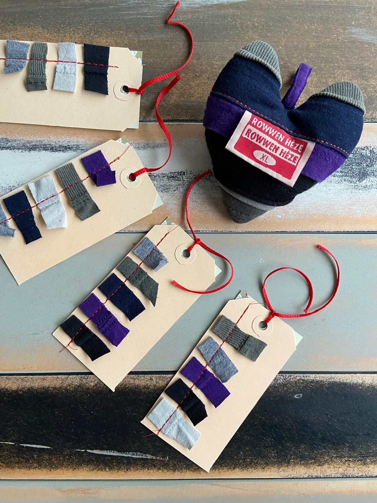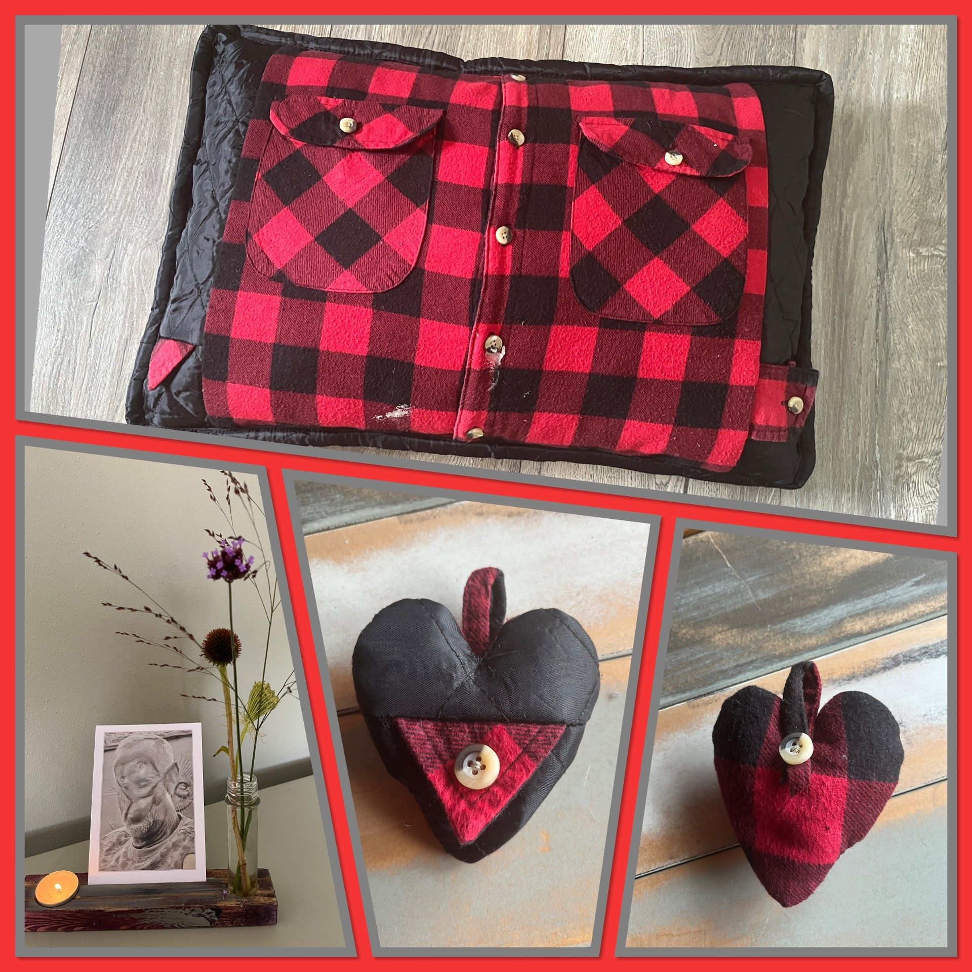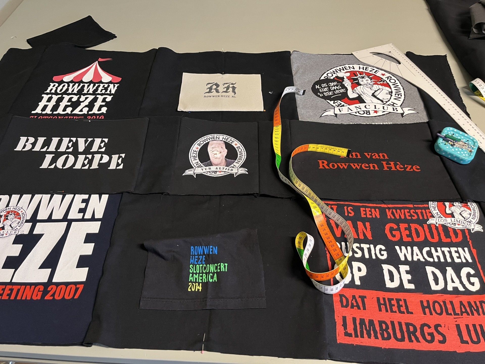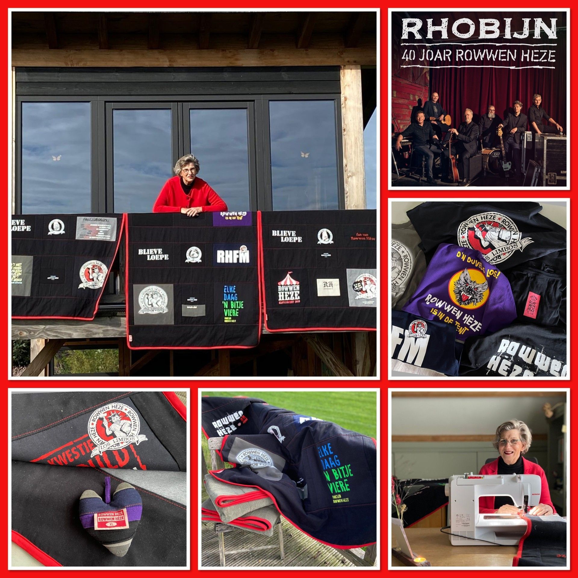 Zijn vrouw wilde als verrassing voor hun drie zonen stoere dekens van al zijn Rowwen Hèze-shirts laten maken. Voor zichzelf koos ze een kussen van zijn rood-zwart geruite werkhemd. Het binnenkussen maakte ik van zijn Rowwen Hèze-shirt, met daarin verwerkt de tekst ‘Blieve loepe’.