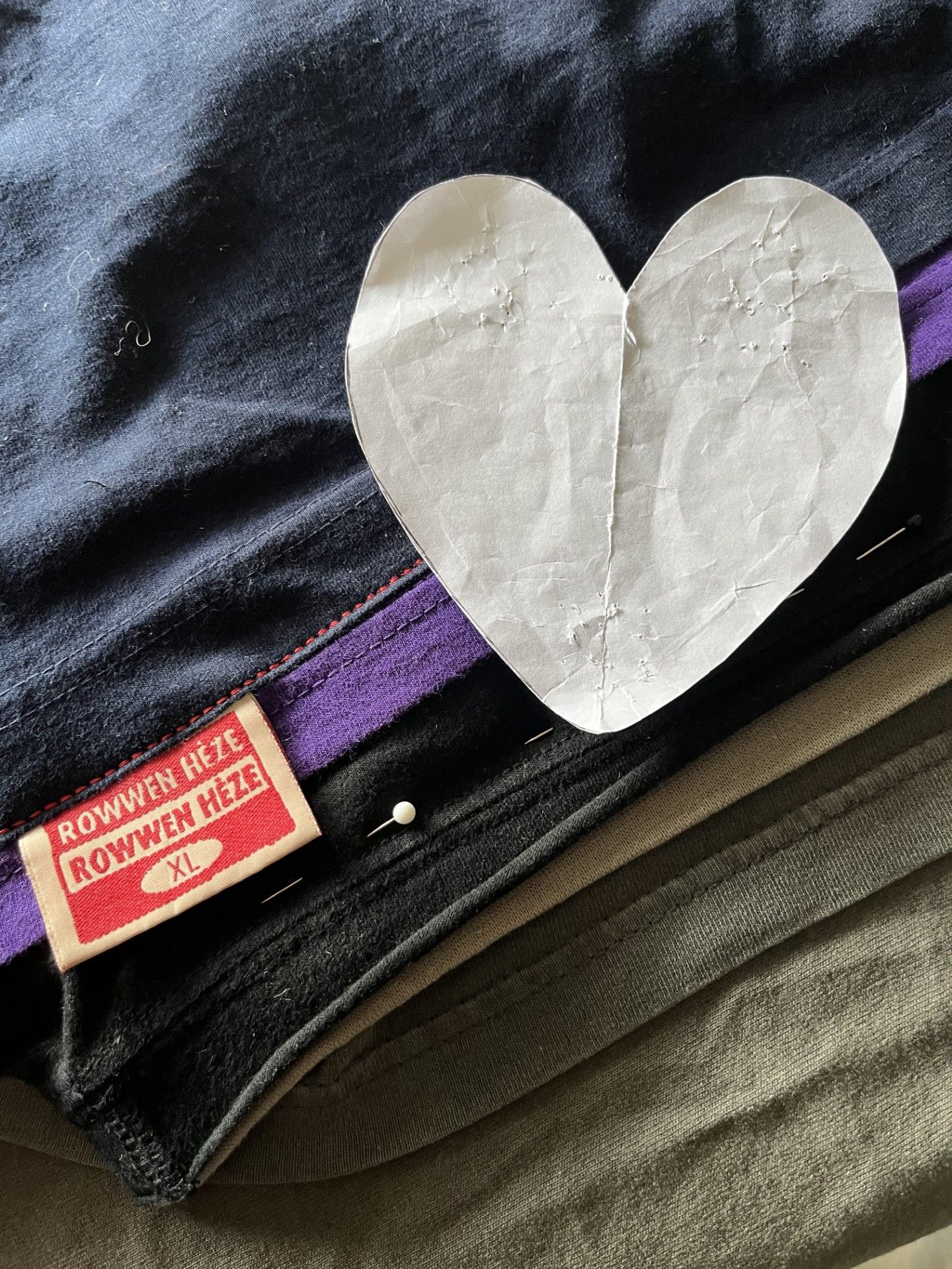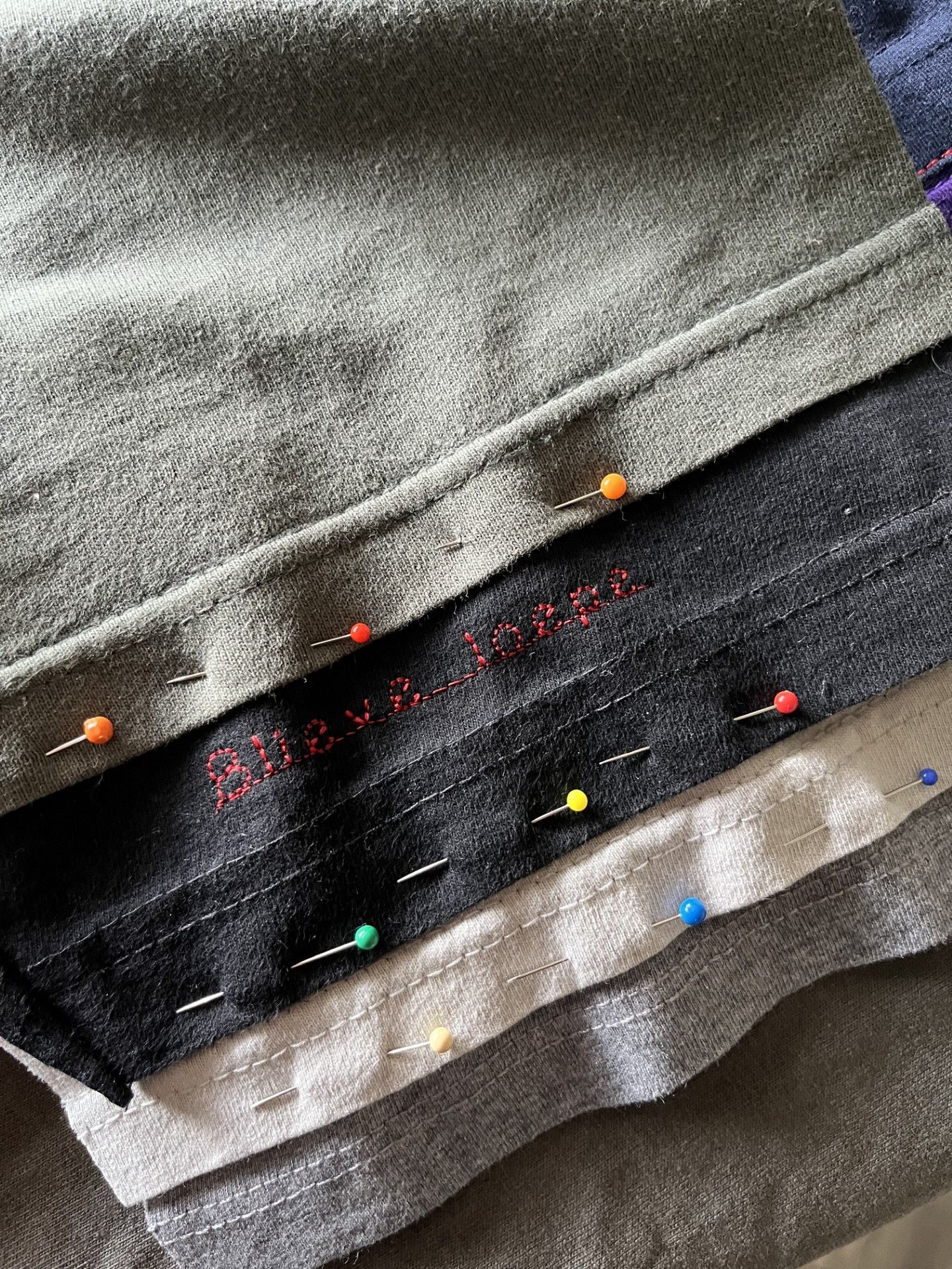 De drie herinneringsdekens kregen een zwarte spijkerstof voorkant, waarin de prints en teksten van de shirts terugkomen. De achterkant maakte ik van stoere, brede ribfluweel.